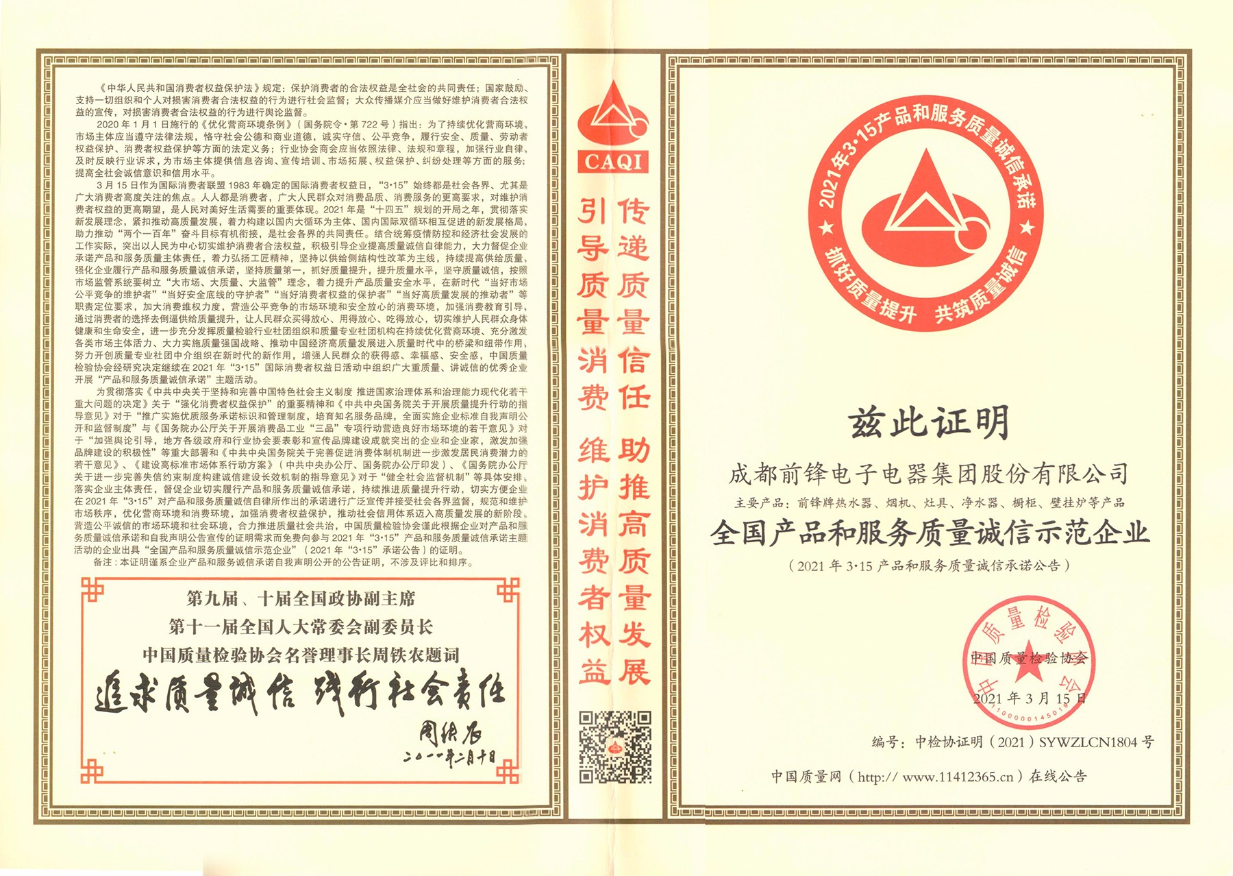 前鋒廚電榮獲中國(guó)質(zhì)量檢驗(yàn)協(xié)會(huì)授予榮譽(yù)稱號(hào)