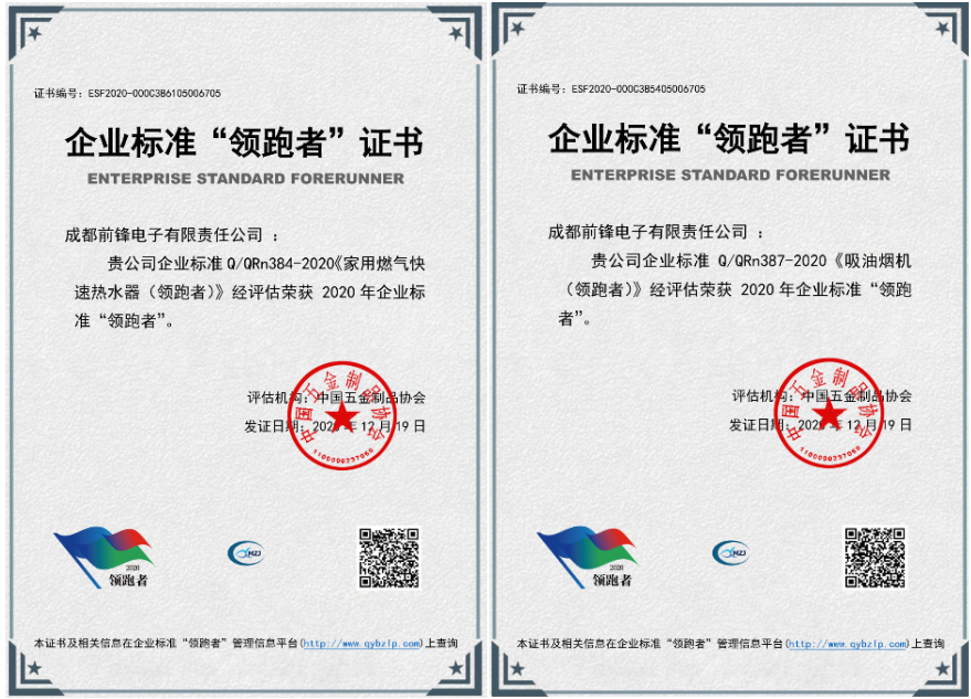 成都前鋒電子有限責任公司生產(chǎn)的前鋒牌燃氣熱水器F902、F908和吸油煙機L803分別榮獲企業(yè)標準《家用燃氣快速熱水器(領跑者)》、《吸油煙機(領跑者)》。