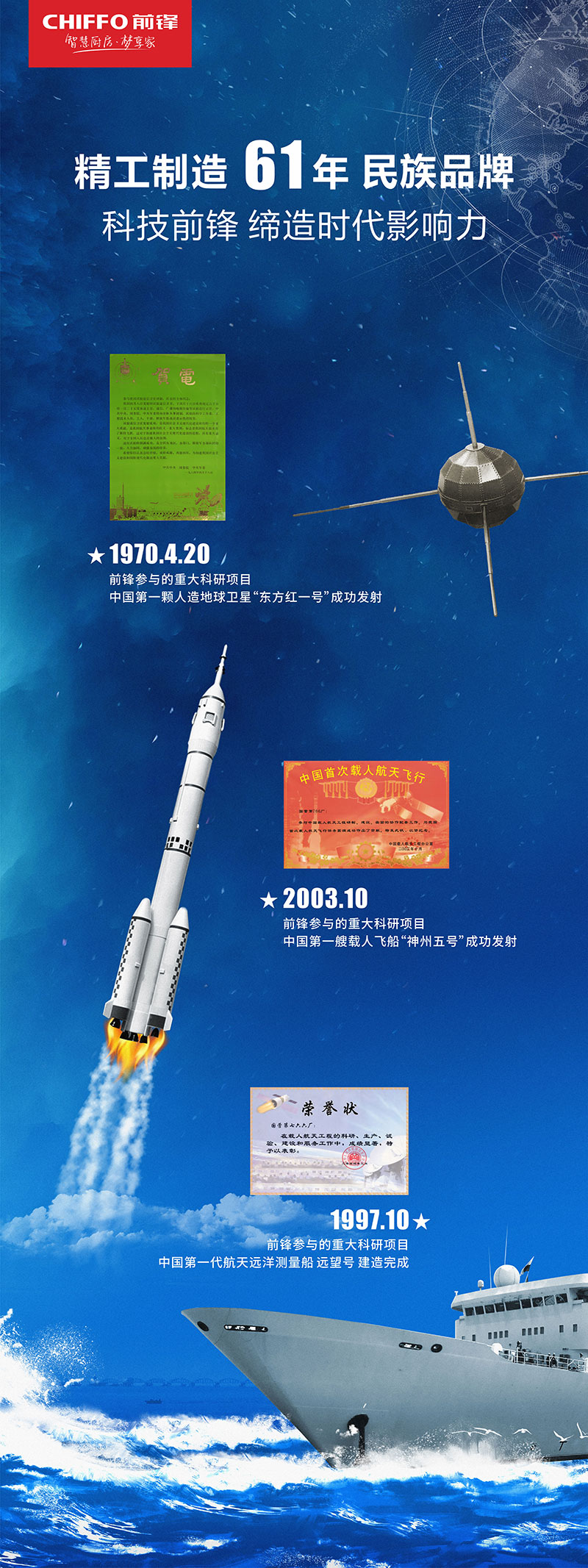 前鋒作為行業(yè)知名的技術(shù)先導型企業(yè),擁有六十一年的發(fā)展歷程,在新中國成立之后的這70年發(fā)展進程中,緊隨國之發(fā)展,擔歷史使命,先后參與了眾多國家重大科研項目,其中包含中國第一顆人造衛(wèi)星“東方紅一號”成功發(fā)射,中國第一艘載人飛船“神舟五號”成功發(fā)射,中國第一代航天遠洋測量船“遠望號”建造完成等。